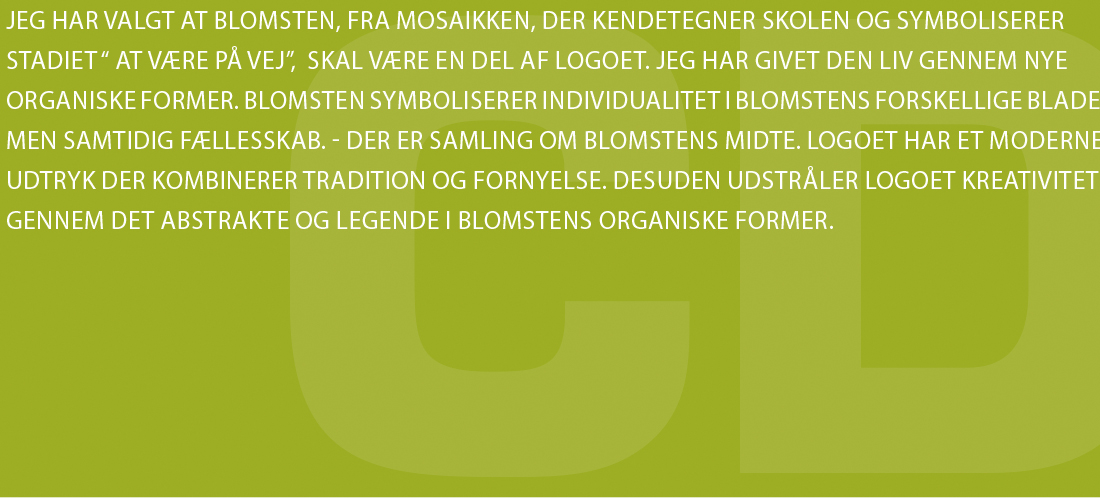 Med udgangspunkt i det eksisterende logo, har jeg designet et nyt moderne logo. Jeg har valgt, at bevare den traditionsrige historie bag Christianshavns Døttreskole, ved at lade de gamle bogstaver CD gå igen, på en ny måde. Årstallet 1799 er ligeledes en vigtig faktor, der angiver tradition, historie og værdier. Desuden har jeg valgt at blomsten, fra mosaikken, der kendetegner skolen og symboliserer stadiet “ at være på vej”,  bliver en del af logoet. Jeg har givet den liv gennem nye organiske former. Blomsten symboliserer individualitet i blomstens forskellige blade, men samtidig fællesskab, hvor der er samling om blomstens midte. Logoet har et moderne udtryk, der kombinerer tradition og fornyelse. Desuden udstråler logoet kreativitet gennem det abstrakte og legende i blomstens organiske former.