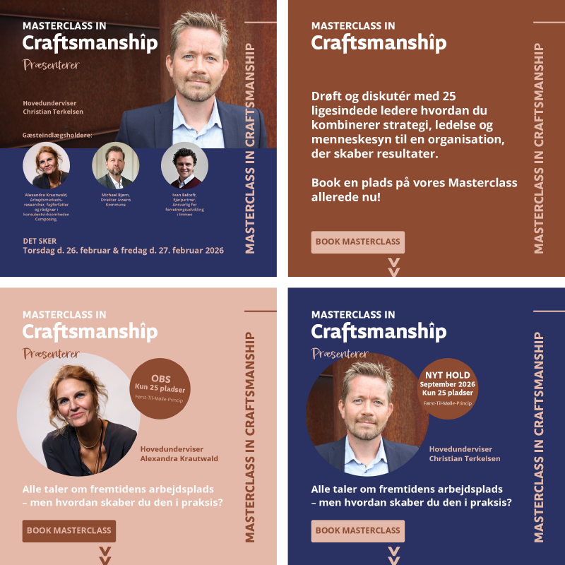 Jeg hjælper Craftsmanship med opsætning af Christians artikler samt grafisk materiale og kommunikation i forbindelse med de ledelsesseminarer Charistian afholder. Invitationer, LinkedIn grafikker samt Præsentationsmateriale, så udtryk og design afspejler det professionelle indhold.